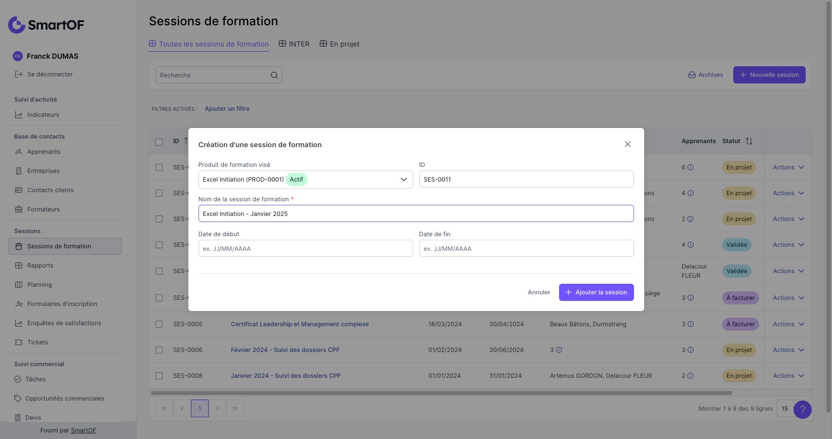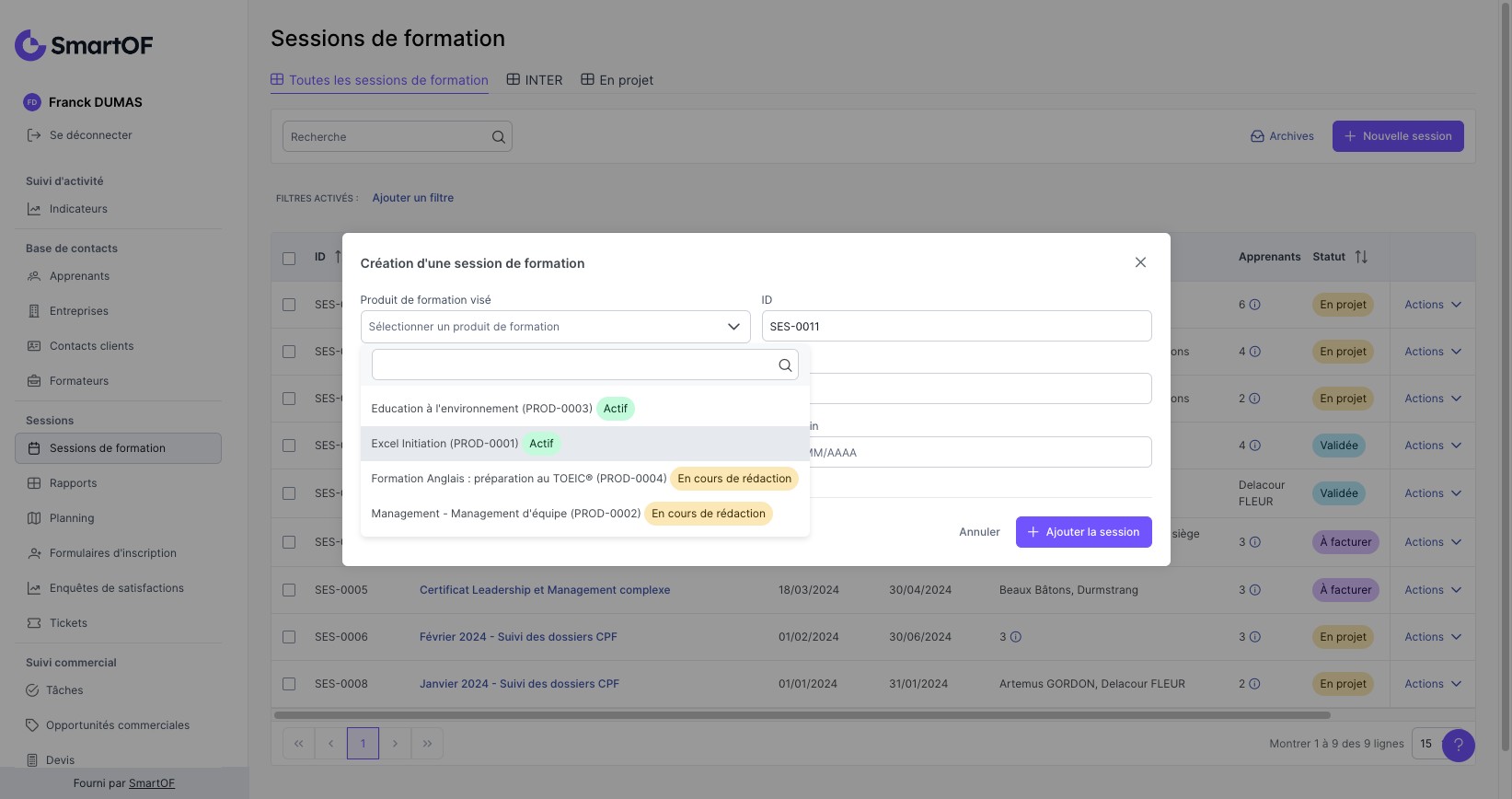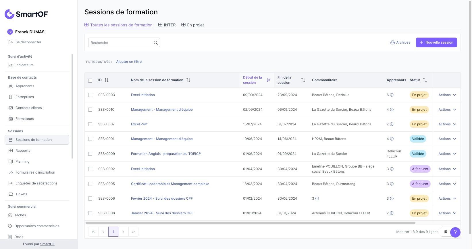 Dans SmartOF, une Session de formation permet de gérer toutes les modalités : INTER, INTRA, distanciel, e-learning, etc.