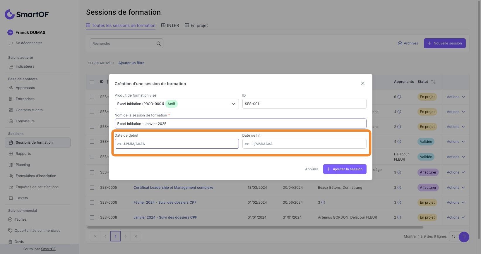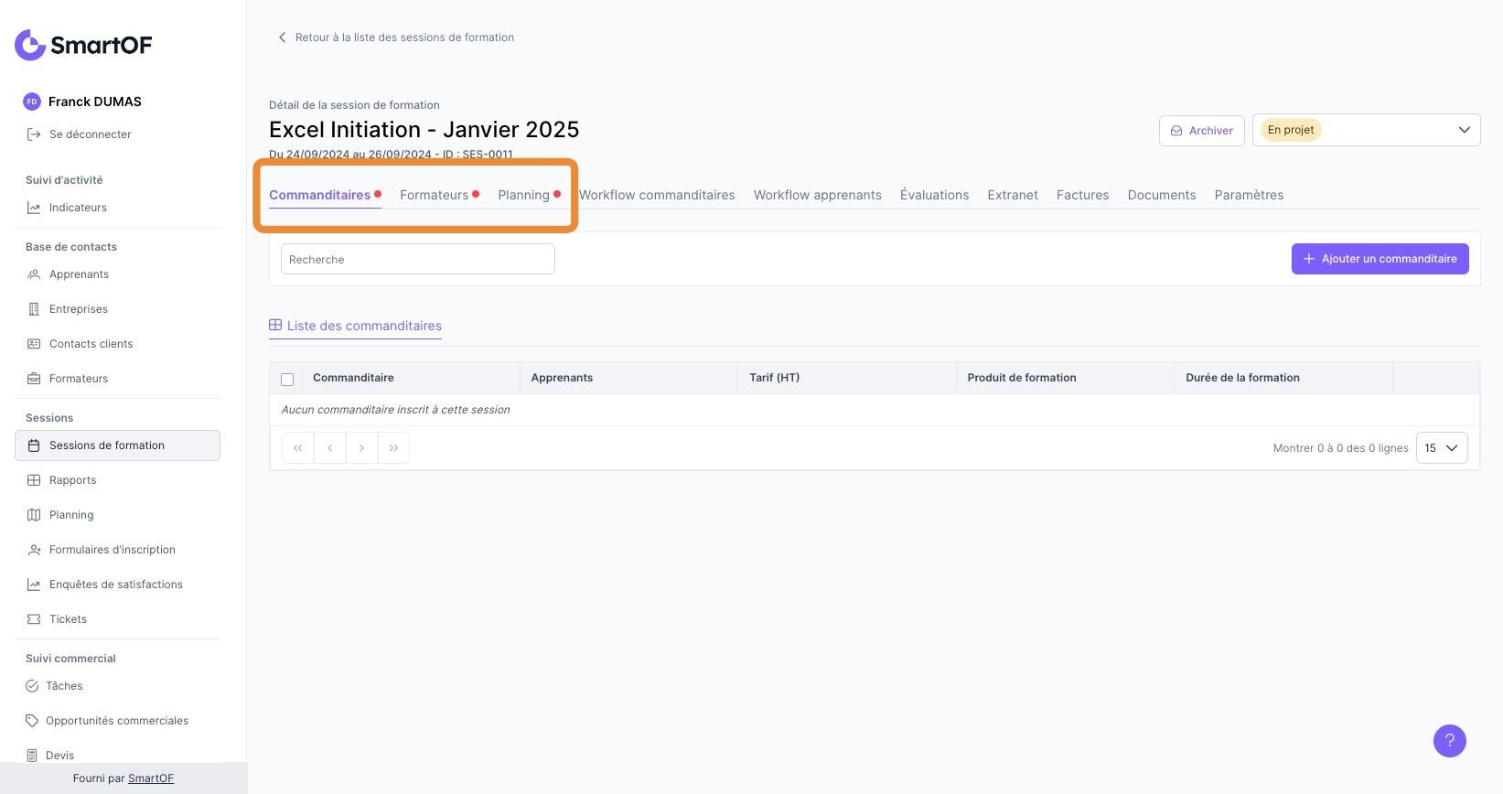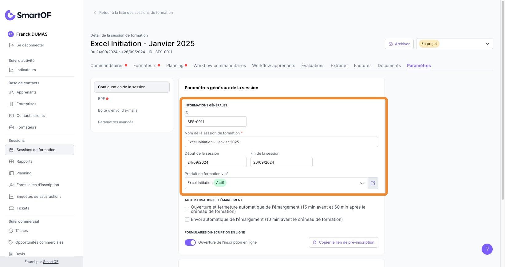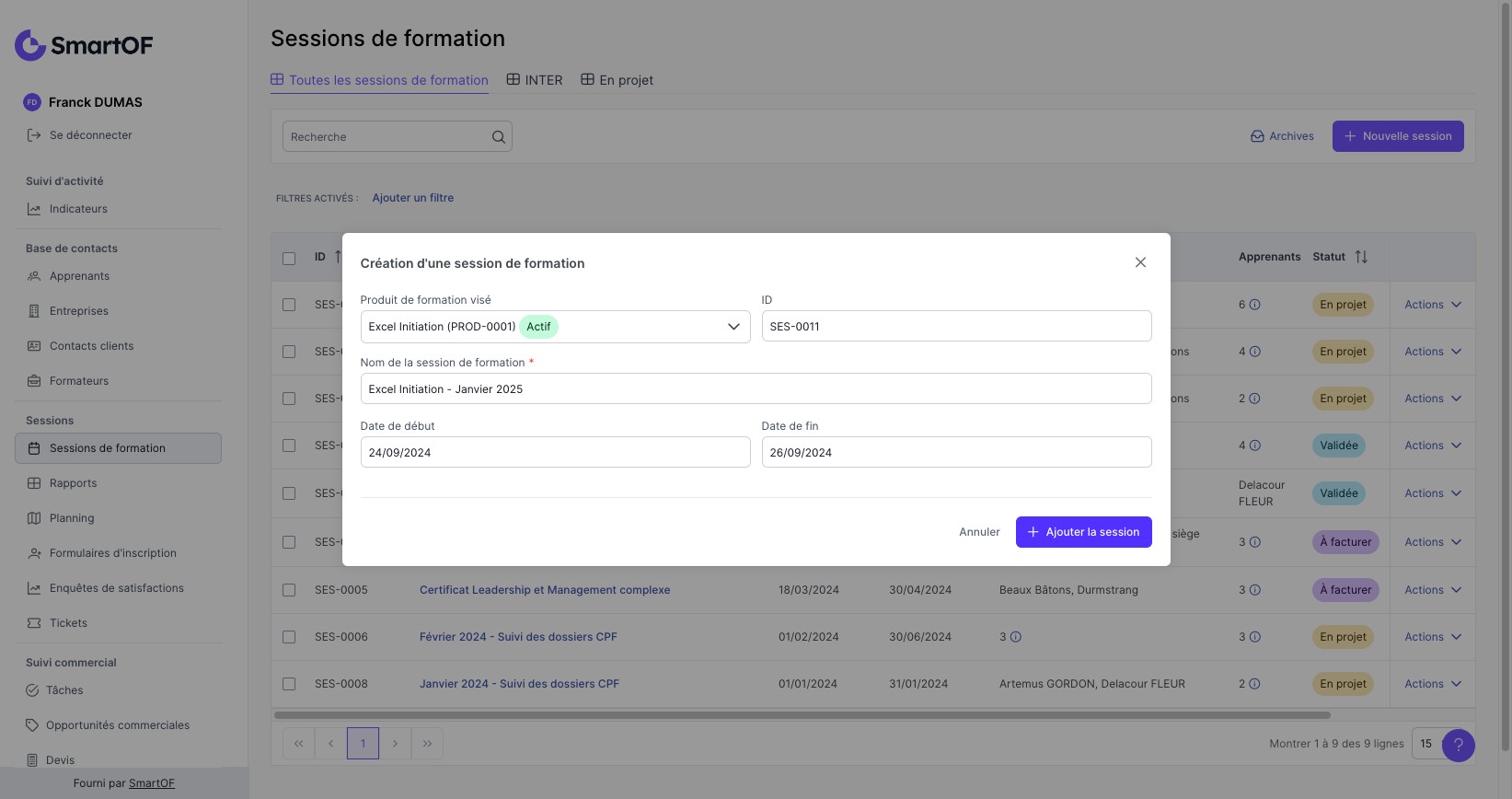 Dans SmartOF, une Session de formation permet de gérer toutes les modalités : INTER, INTRA, distanciel, e-learning, etc.