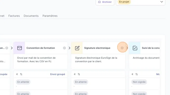 - Workflow Commanditaires : regroupe les actions à réaliser avec vos commanditaires, comme l’édition et la signature de la convention de formation.